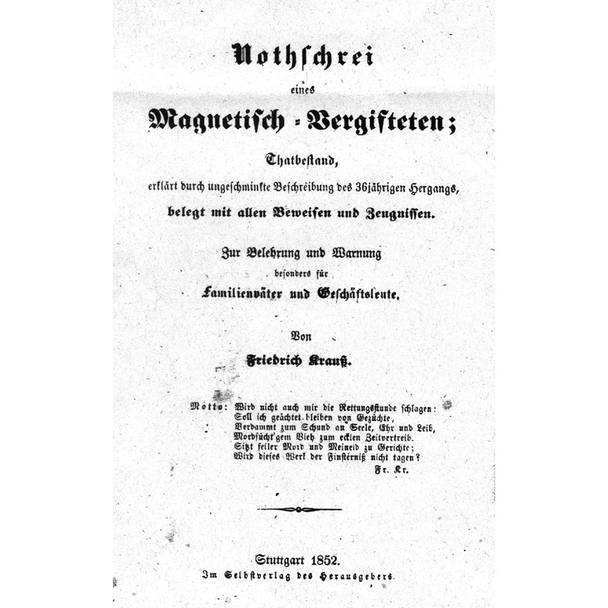 Krauß, F. (1852): Nothschrei eines Magnetisch-Vergifteten; Thatbestand, erklärt durch ungeschminkte Beschreibung des 36jährigen Hergangs, belegt mit allen Beweisen und Zeugnissen. Zur Belehrung und Warnung besonders für Familienväter und Geschäftsleute. Stuttgart: Author.